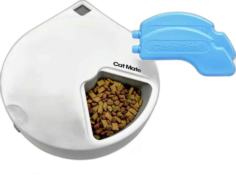 Le Cat Mate C500 est un distributeur à 5 compartiments conçu spécialement pour les chats. À 45 euros, il se distingue par sa compatibilité avec la nourriture humide et son pain de glace intégré pour maintenir la fraîcheur.